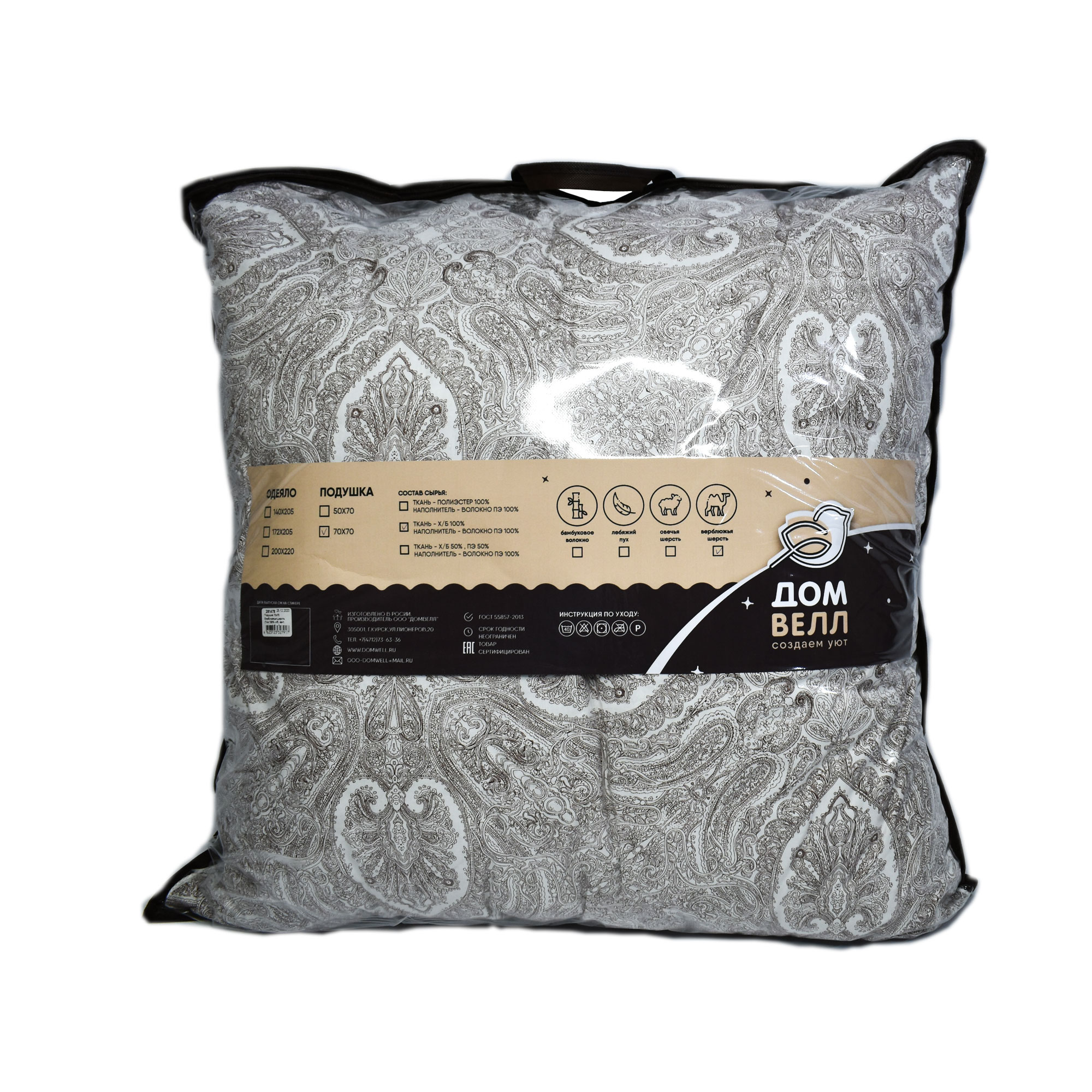 Подушка 70х70 Верблюжья шерсть (Тик 100% х/б, кант, чемодан) ДомВелл